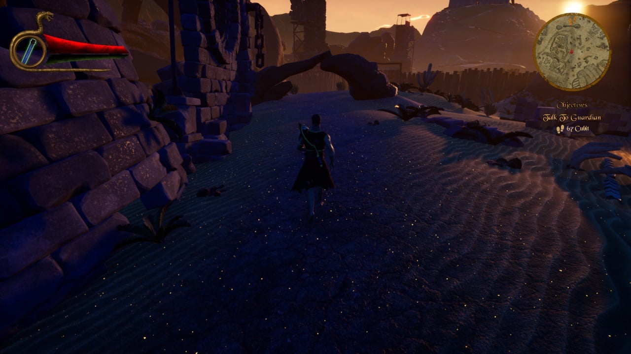 Наемник большую часть времени сражается с гигантскими скорпионами и другими врагами, занимается паркуром и взаимодействует с рычагами. Он также может находить сундуки с лутом и общаться с NPC. Бои проходят в реальном времени. Геймер может разрушать обычные или взрывоопасные ящики, собирая золото или нанося дополнительные повреждения противникам. В проекте предусмотрено несколько ракурсов камеры: сражения видны сверху, акробатические навыки демонстрируются сбоку, а поездка на маунте — со спины персонажа.