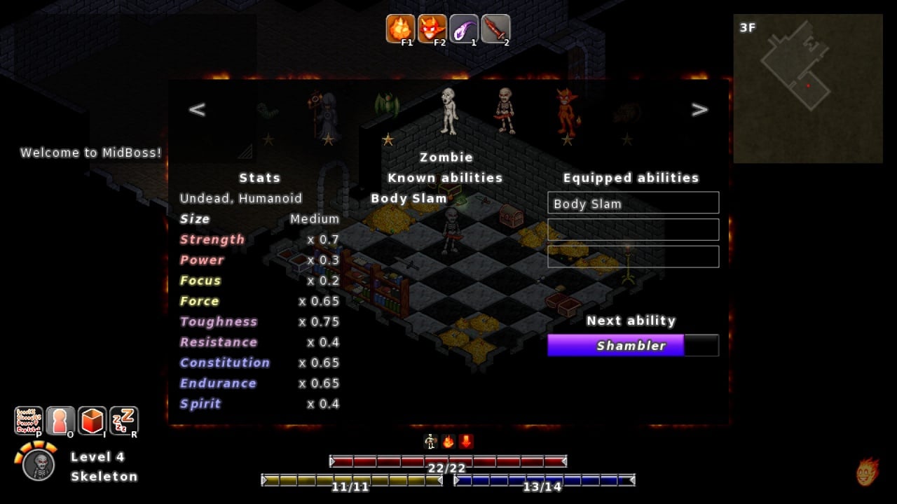 MidBoss – изометрический пошаговый рогалик, где геймеру предстоит управлять уникальным антигероем. Протагонист способен вселяться в тела поверженных врагов, получая их способности. Для трансформации необходимо произнести заклинание перед атакой. Сменяя форму, персонаж постепенно осваивает новые скиллы, открывая целых 60 разновидностей навыков.