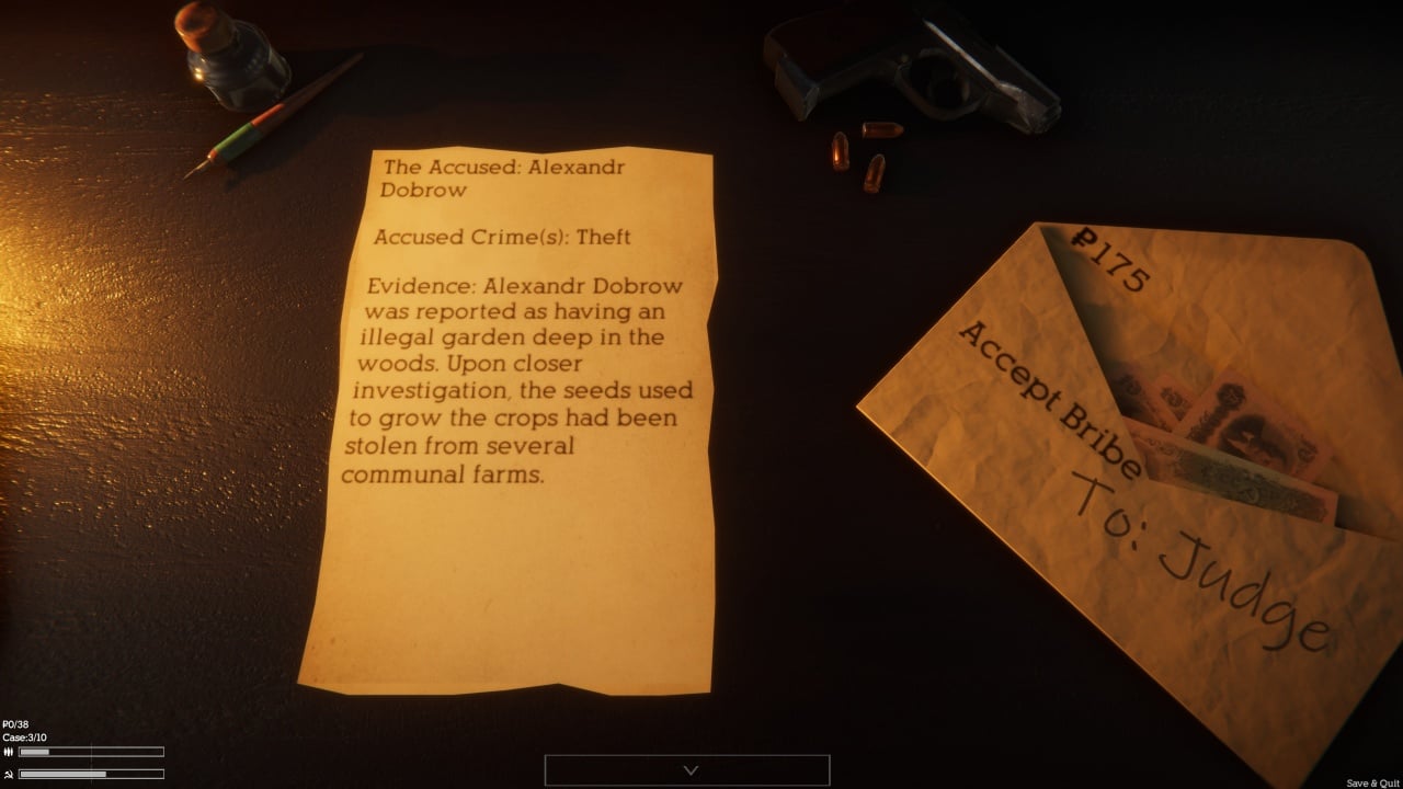 Перед вами открывается дело обвиняемого. Вам предстоит решить: осудить или оправдать. Осуждение приведёт к заключению или даже расстрелу. Вы станете национальным героем, служащим на благо страны. Оправдание же сделает вас любимцем народа, но обернётся множеством врагов среди властей.
