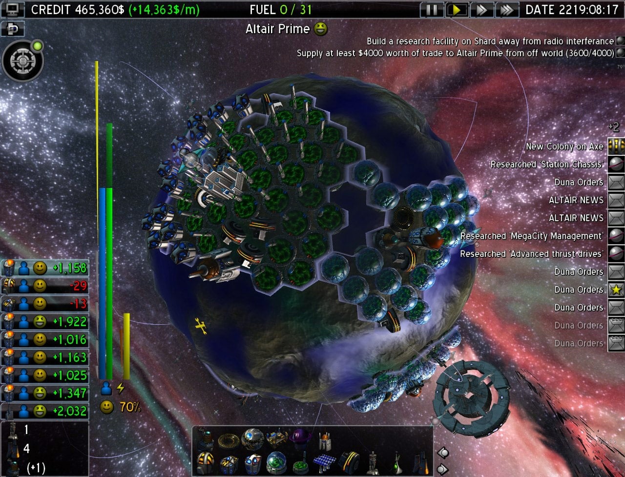 Геймплей охватывает как планетарное строительство, так и масштабные космические сражения. Здесь сочетаются градостроительство, дипломатия, торговля и орбитальные битвы с врагами. Выбирайте планеты или астероиды для застройки, управляйте ресурсами и армией, превращая свою базу из скромной колонии в мощный технологический центр. Сюжетная линия глубоко исследует судьбу Земли.