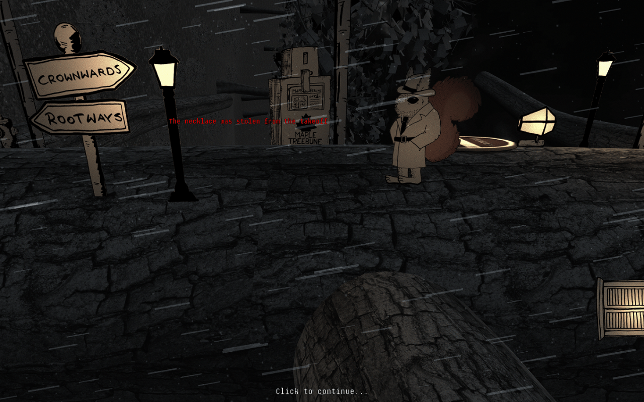 Протагонист – белка-журналист, охотящийся за интересными случаями для расследования. Ему становится известна тайна, известная как “Большой Клён”. Это единственная зацепка, доступная виртуальному протеже. В процессе общения с персонажами, участвующими в развитии сюжета, пользователь получает новые сведения и подсказки, которые помогают продвигаться дальше в раскрытии дела. Тайтл богат событиями, происходящими во время путешествия главного героя. Помимо решения головоломок различной сложности, геймер проводит много времени в диалогах с запоминающимися персонажами, обладающими уникальными характерами. Локации представляют собой небольшие территории, помещающиеся на один экран монитора. Здесь есть леса, жилища героя и других персонажей, офисы, магазины и многое другое.