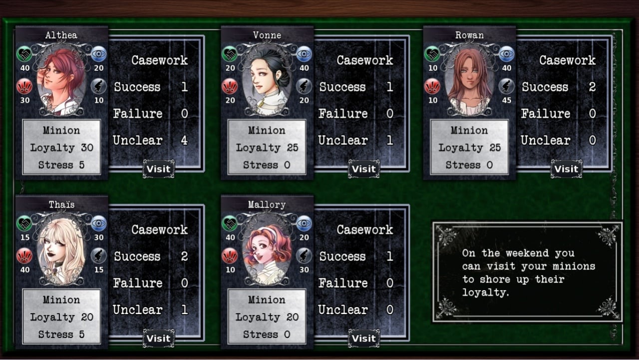 В вашей команде завёлся предатель, которого нужно разоблачить. Остальные персонажи имеют уникальные черты и предыстории. Каждую неделю вам будут выдаваться случайно сгенерированные задачи с сроками исполнения. Подчинённые обладают особыми навыками: скрытность, наблюдательность, общение и запугивание. Как в RPG, здесь есть предметы для улучшения способностей и механика прокачки за успешные задания.