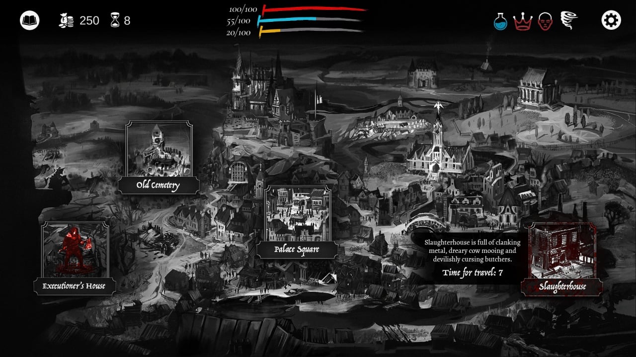Интерфейс преимущественно текстовый, погружая вас в увлекательную историю в мрачной атмосфере, полной моральных противоречий!