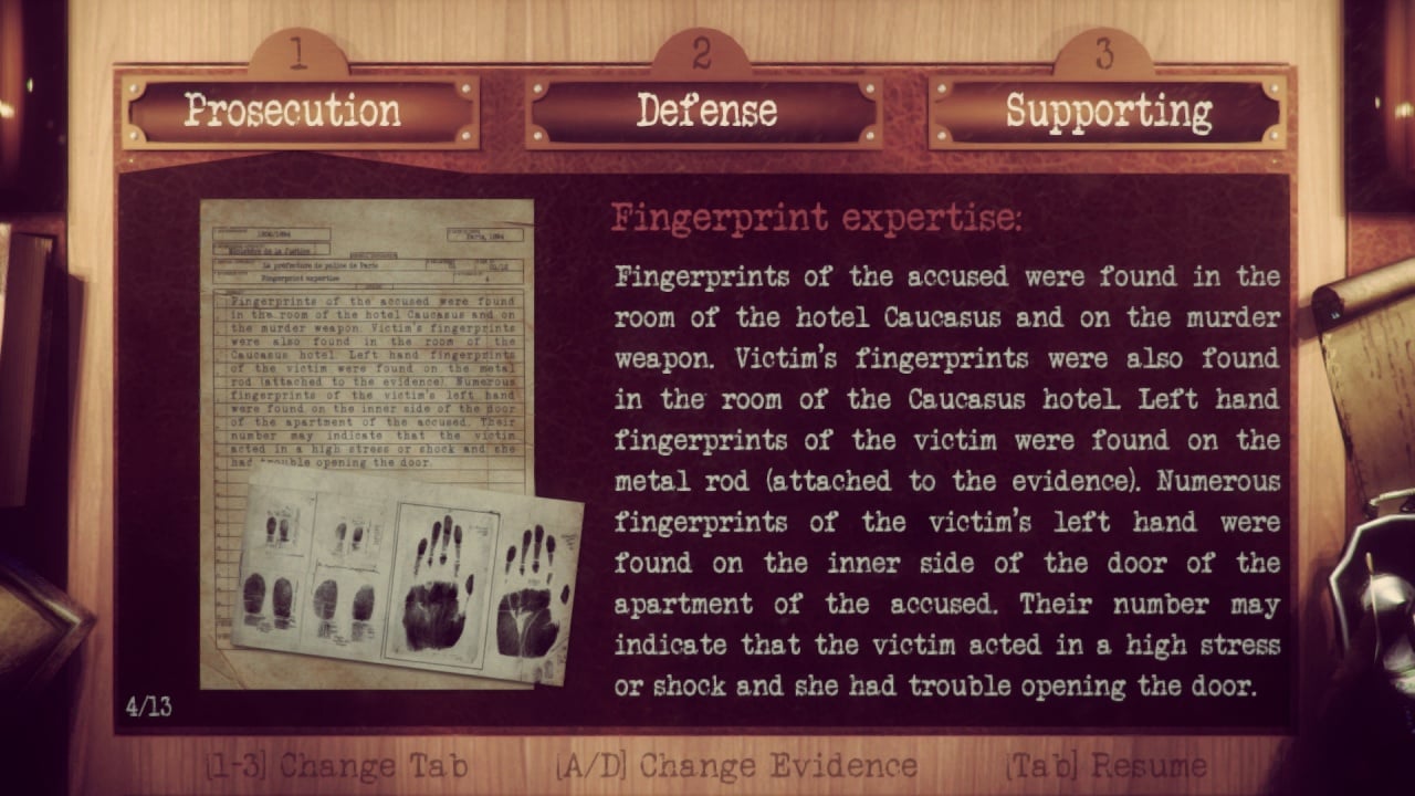 В настоящем времени вам предлагают изучить доказательства, выслушать свидетелей и ответить на вопросы судьи. Каждый вопрос возвращает в прошлое, где вам предстоит совершать действия, становящиеся основой показаний Альфреда. Любое обвинение можно опровергнуть, если приложить усилия.