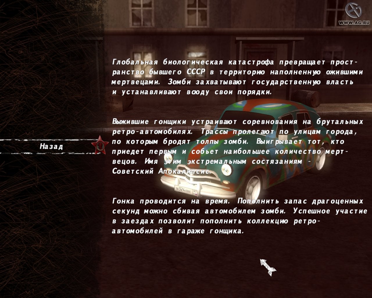 Сюжет рассказывает о катастрофическом выбросе, охватившем Советский Союз. В результате биологической катастрофы люди начали превращаться в нежить. Большая часть территории оказалась под контролем зомби, которые установили свои порядки. Выжившие решили сражаться с этим ужасом с помощью ретро-автомобилей.
