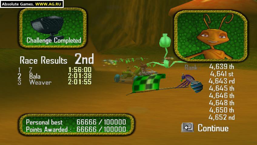 Транспорт здесь представлен в эксцентричном исполнении. Вашими «машинами» могут стать консервные банки, ореховые скорлупы и невероятно быстрые жуки. Основная задача — оставить соперников позади, заставив их видеть только клубы пыли. Убедитесь, что вы пересекли финишную черту первыми. Пусть остальные только мечтают о победе! Садитесь за новую божью коровку, которая способна развить умопомрачительную скорость в 1 км/ч! Antz Extreme Racing — это самые динамичные гонки, когда-либо созданные! Но не забывайте, что главное — участие. Хотя кто откажется от приза за первое место? Особенности Antz Extreme Racing: