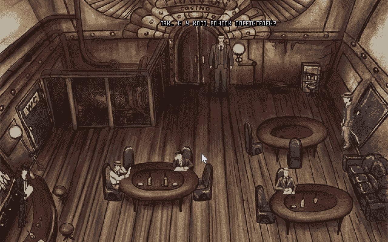 Анимация в Casino Noir почти отсутствует. Вместо кинематографических заставок здесь используются текстовые вставки, наложенные на статичные изображения. Протагонист мгновенно перемещается между экранами, не совершая шагов внутри локаций. Он занимает фиксированное положение в углу зоны, даже если геймер кликает на NPC или предметы. В инвентаре хранятся все найденные вещи, но окружающие персонажи обычно не проявляют активности.