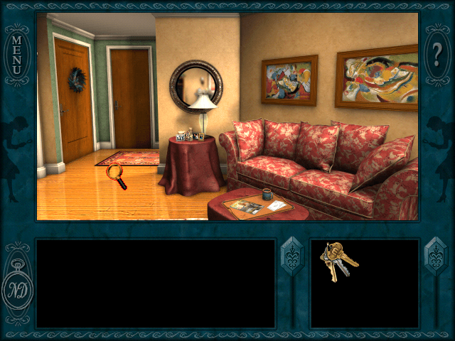 Проект "Нэнси Дрю: Опасность за каждым углом" — это квест от первого лица с экраном, разделенным на три сегмента. Самая большая область отображает то, что видит главная героиня: персонажи, объекты, декорации и прочее. Внизу — текстовые описания и диалоги, справа — инвентарь.