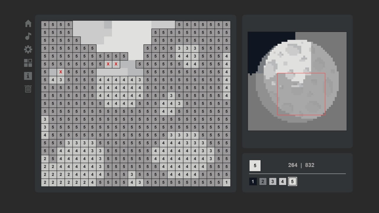 На старте уровня перед пользователем развертывается огромное полотно. Камеру можно перемещать и масштабировать для удобства работы. Каждый пиксель пронумерован, что хорошо видно при максимальном приближении. Цифры соответствуют оттенкам, которые необходимо наносить для завершения изображения, которое позже можно изучать в отдельном пункте главного меню.