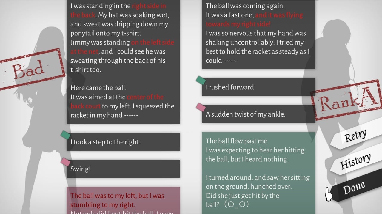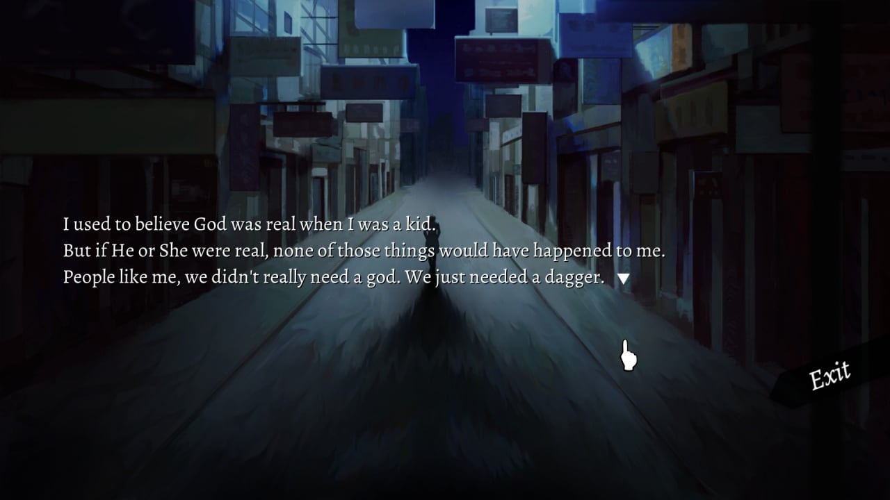 Основная история сочетает милые, юмористические и мрачные моменты. Этот инди-проект предназначен для взрослой аудитории, поскольку в сюжете присутствуют текстовые описания убийств, расчленения, насилия, включая сексуальное, и надругательства над детьми. Иногда шокирующие моменты сопровождаются звуками и изображениями с каплями крови. Ход событий можно изменить.