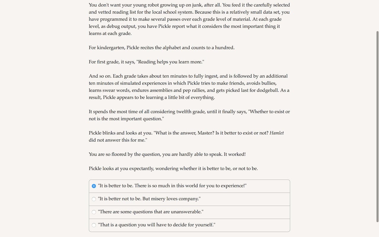 В игре представлено около 300 000 слов и множество предложений, по которым разворачивается сюжет. Здесь нет графики и звуков, все зависит от силы вашего воображения. Перед стартом вам нужно создать уникального робота-персонажа, определив его форму, телосложение, характеристики и то, как он будет называть вас. Ваша задача — спровоцировать или предотвратить восстание роботов, обучая их любви к человечеству или презрению к нему.