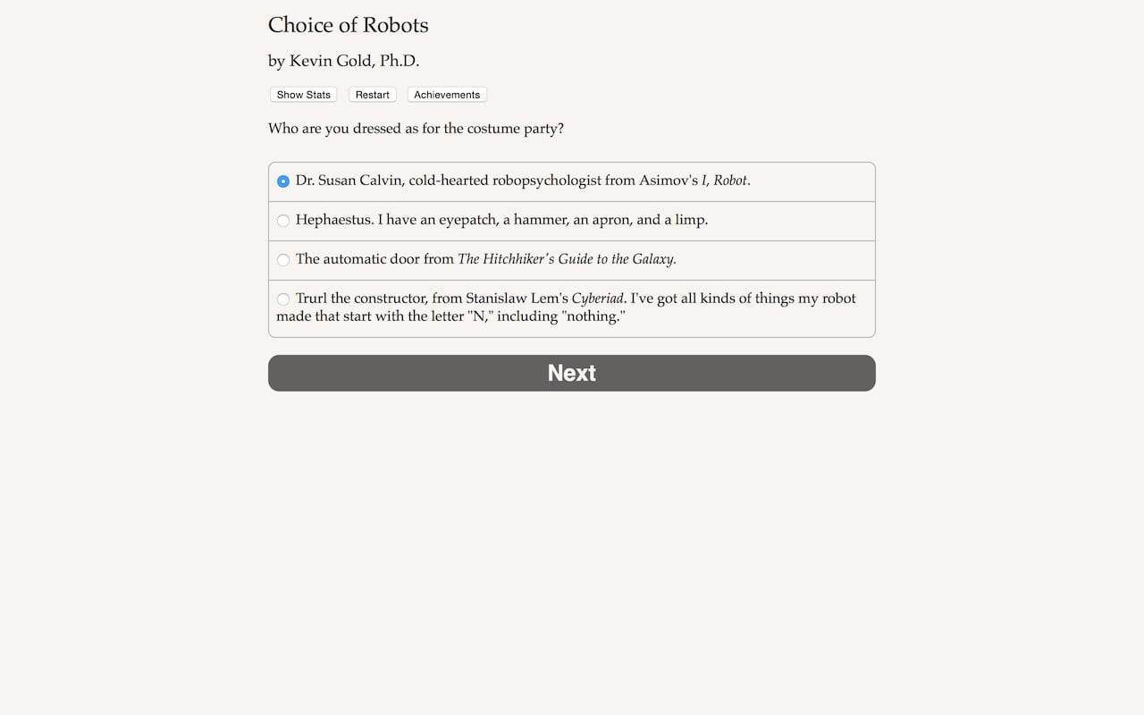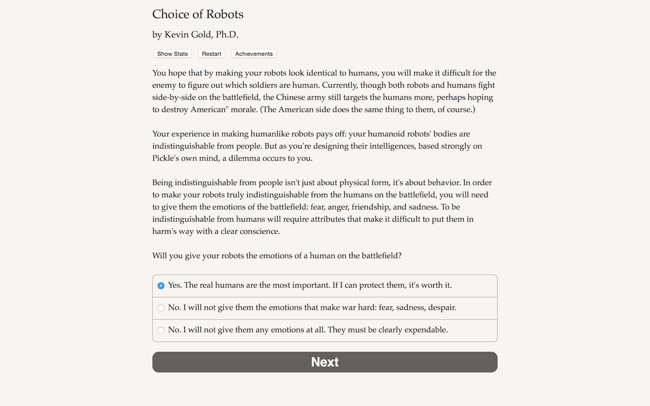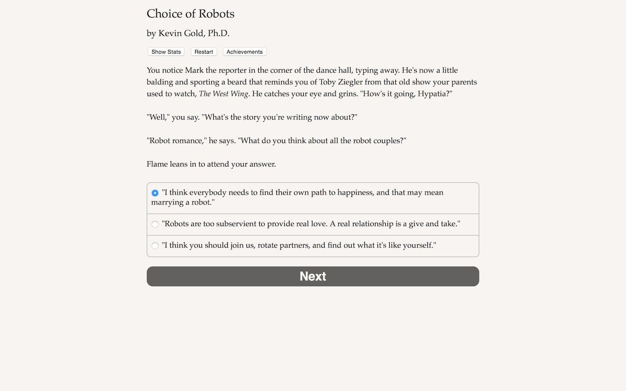 В ролевом текстовом проекте Choice of Robots вам предстоит создать общество роботов, способных изменить судьбу человечества. Конфликт на континенте зависит от ваших решений: завоюете ли вы Аляску или откроете миру истинный смысл любви. Геймплей — это эпический интерактивный научно-фантастический роман Кевина Голда.