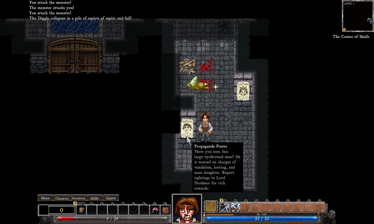 Dungeons of Dredmor – это ироничный пошаговый рогалик с видом сверху. Бои здесь проходят поочередно. Сначала герой (или героиня) атакует, затем действуют враги. Проект хардкорный, но новичкам доступен обучающий режим и возможность настроить сложность. Наполнен множеством шуточных отсылок к поп-культуре, мемам и игровой индустрии. Среди других тайтлов выделяется отсутствием классовой системы.