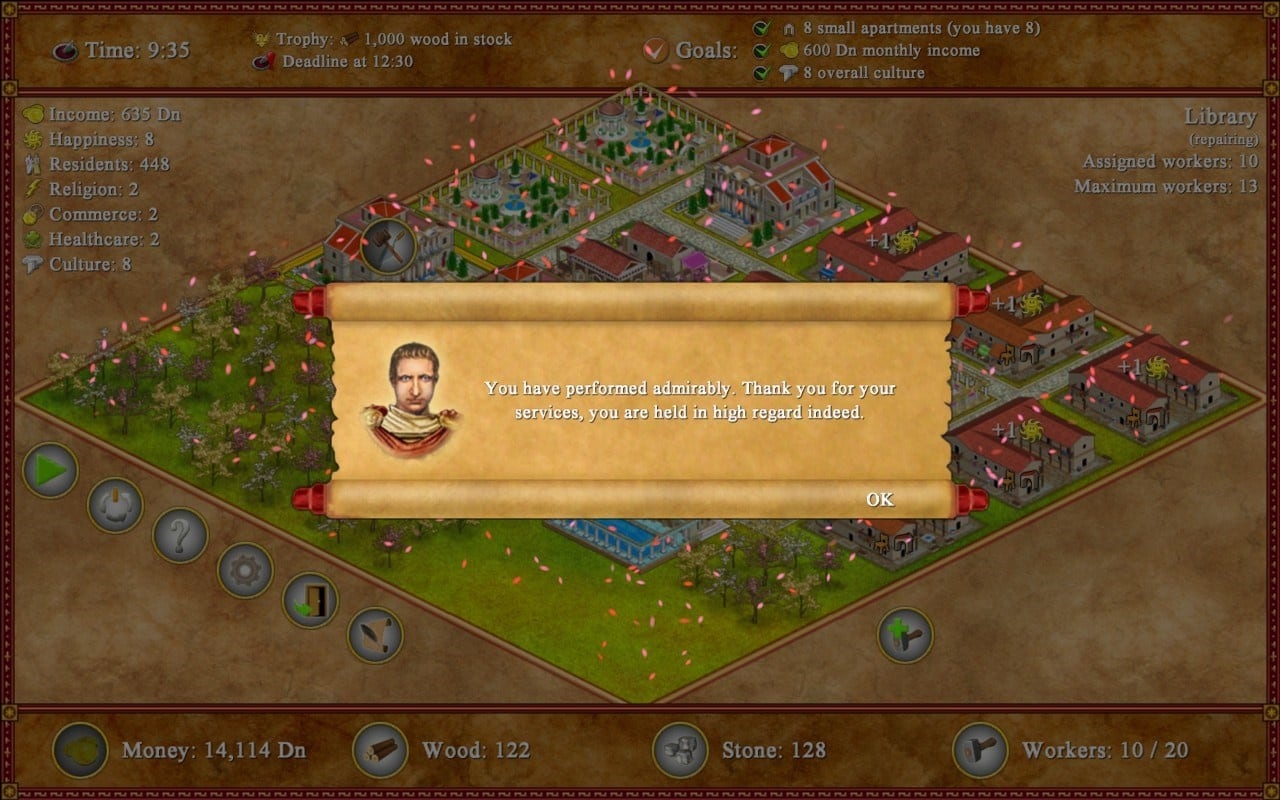 Обеспечьте процветание своим поселенцам. Тщательно планируйте расположение зданий, расставляйте элементы декора и создавайте комфортные условия для жизни. Чем лучше обстановка в городе, тем выше налоги, которые платят жители. Геймплей Romopolis сосредоточен на финансовом управлении и экономических стратегиях.