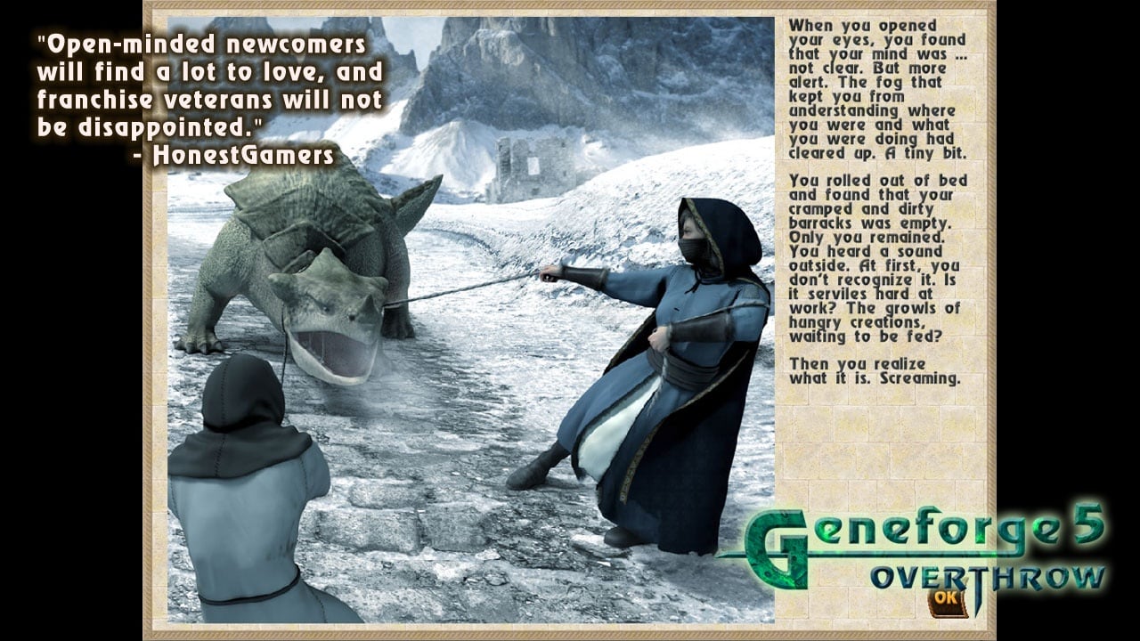 Geneforge 5: Overthrow – ролевая приключенческая игра с изометрической перспективой, погружающая в мир Шейперс. Это завершающая часть франшизы. Сюжетные линии, как основные, так и побочные, развиваются в течение многочисленных часов однопользовательской кампании. Пользователь сам решает, какие локации исследовать, какие задания выполнять и с какими фракциями взаимодействовать — поддерживать или разрушать их позиции.
