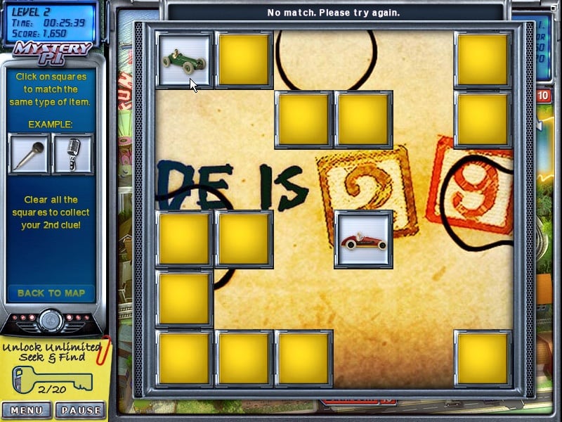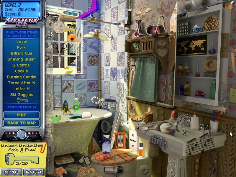 В Mystery P.I. - The Lottery Ticket ключевыми предметами являются специальные ключи, всего 20 штук. Игра предлагает 2 режима: Find the Ticket, где нужно найти билет за ограниченное время, и Unlimited Seek & Find - без спешки, где можно отыскать все спрятанные предметы. Собрав 20 ключей, вы получите доступ к секретной локации.