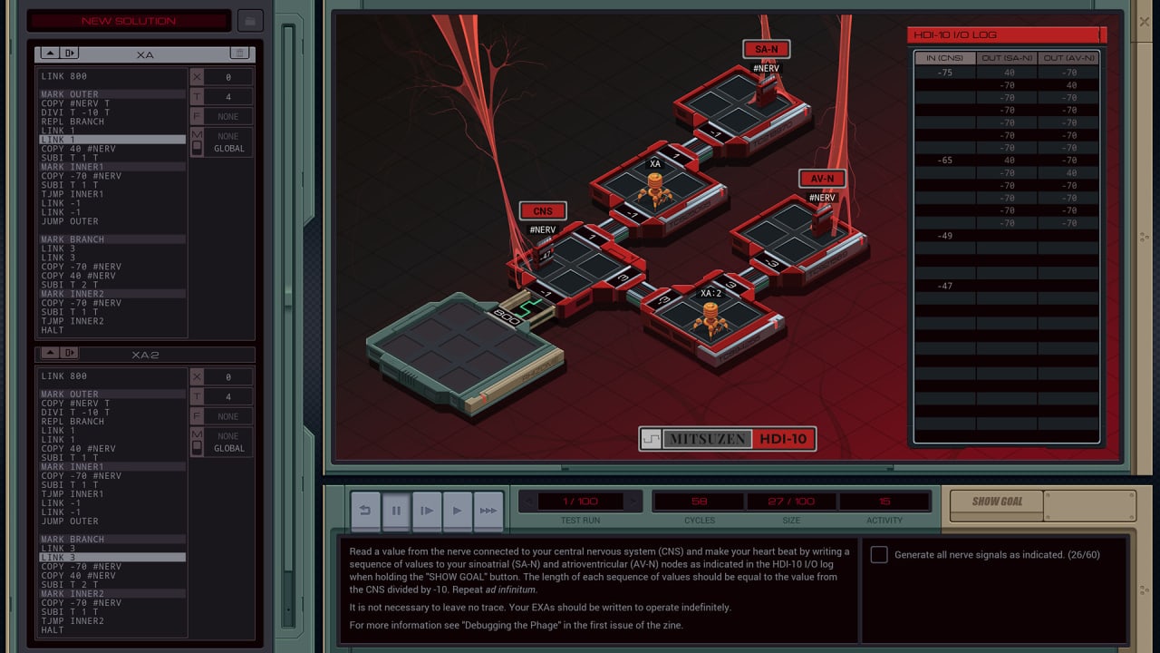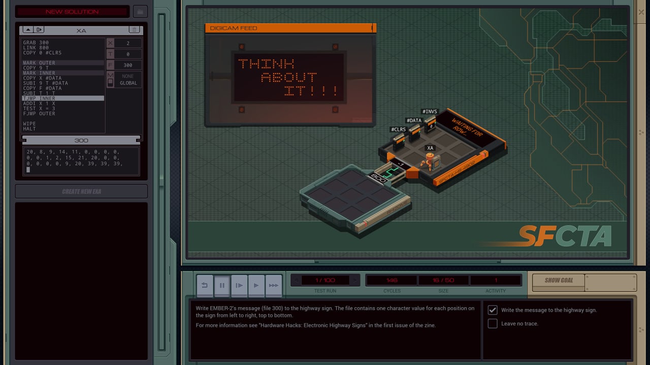 С помощью вакцины протагонист сможет избежать превращения в компьютерный элемент и замедлит прогрессирующее заболевание. Тайный ИИ EMBER-2 ставит перед героем хакерские задачи и помогает ему в их решении. Изучая ЖИНЫ, пользователь освоит взлом сложных систем. Подпольная газета TRASH WORLD NEWS предлагает обширные инструкции по добыче запрещенной информации и взлому программ. Уход без следа, саморепликация, прохождение сетей, нейтрализация враждебных EXA и другие функции выполняются с помощью созданных агентов.