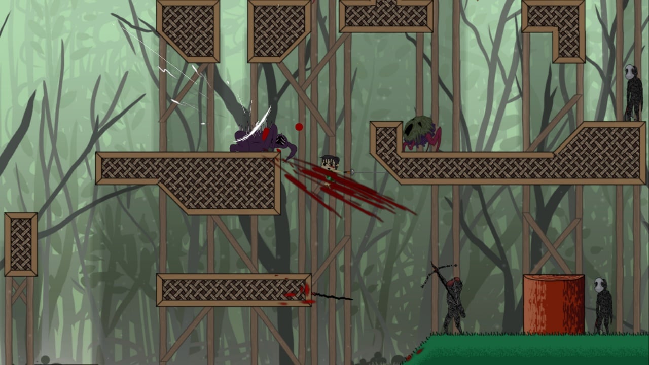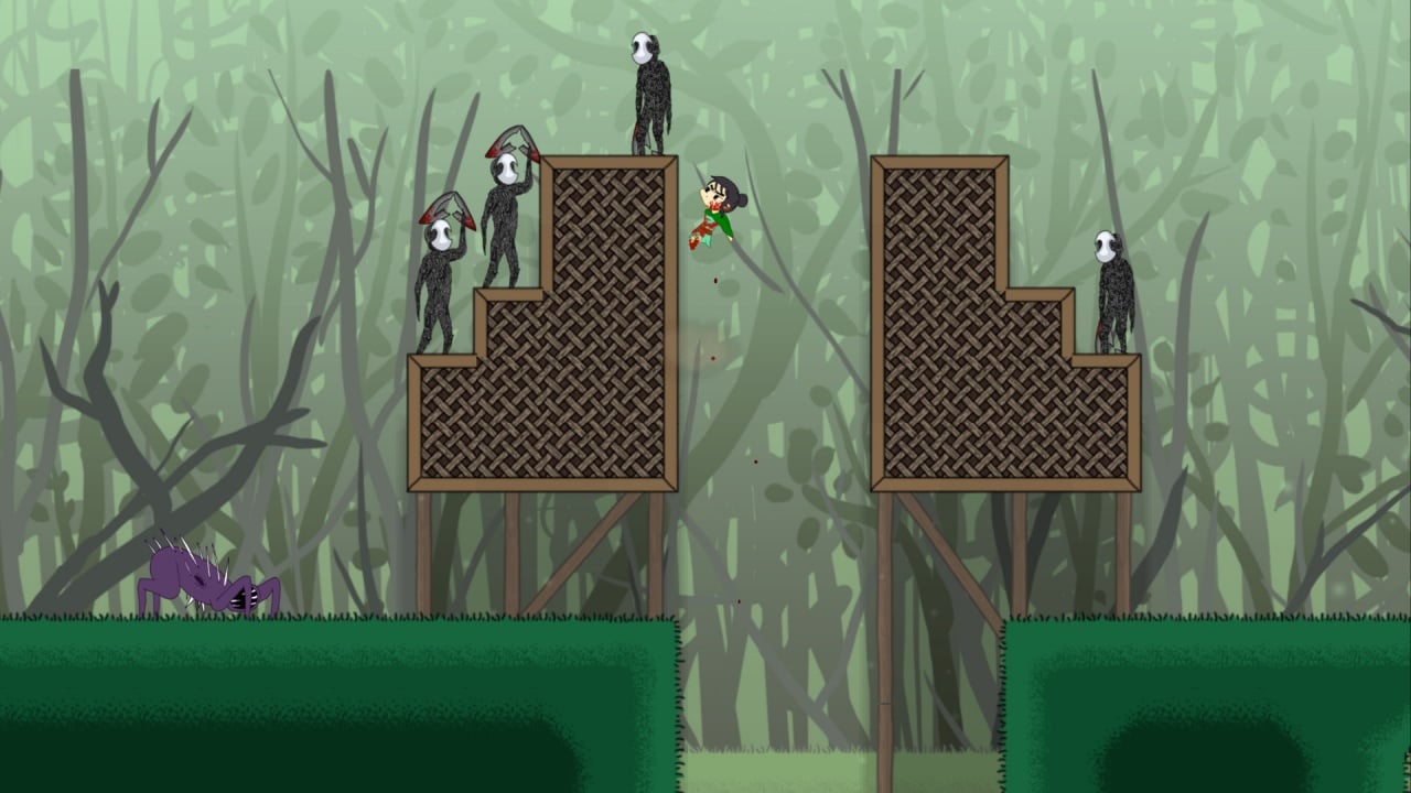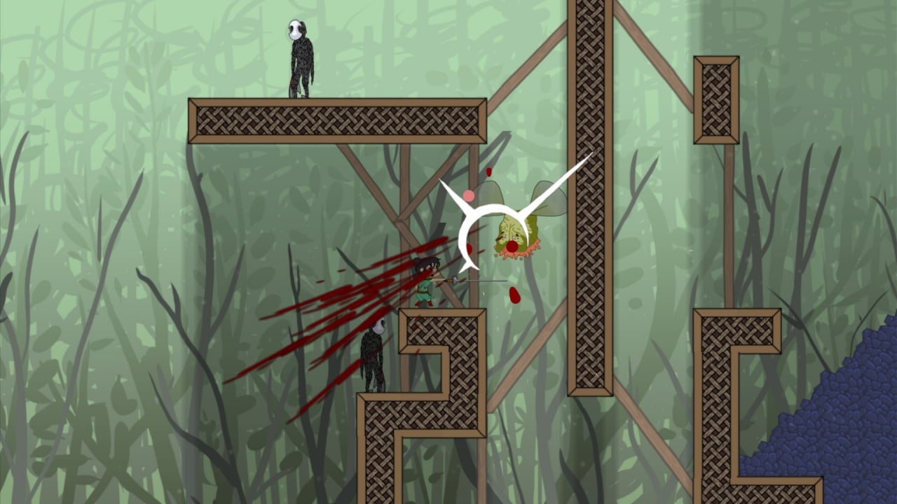 Мечница вооружена клинком, который разит врагов, словно лопасти вентилятора. Для успешного комбо ей необходимо маневрировать и точно рассчитывать прыжки, используя окружающую среду. Скорость боя зависит от темпа нажатия кнопки атаки. Шкала здоровья вмещает десять ударов, после чего приключение начинается заново. Некоторые монстры пассивны, другие нападают, приближаясь сами. Чтобы минимизировать ошибки, нужно изучить поведение врагов и разработать индивидуальную тактику для каждого типа.