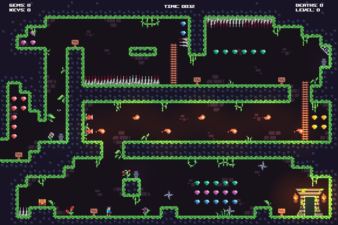 Cursed Gem – инди-проект в ретро-стиле с пиксельной графикой и простыми головоломками. В отличие от классических платформеров, главный герой обладает уникальными способностями: он может двигать предметы и демонстрировать паркур, отталкиваясь от стен. Это позволяет ему забраться на возвышенности. На десяти уровнях разбросано более восьмидесяти комнат, полных капканов и смертоносных механизмов, а стены покрыты загадочными рунами с таинственными посланиями.