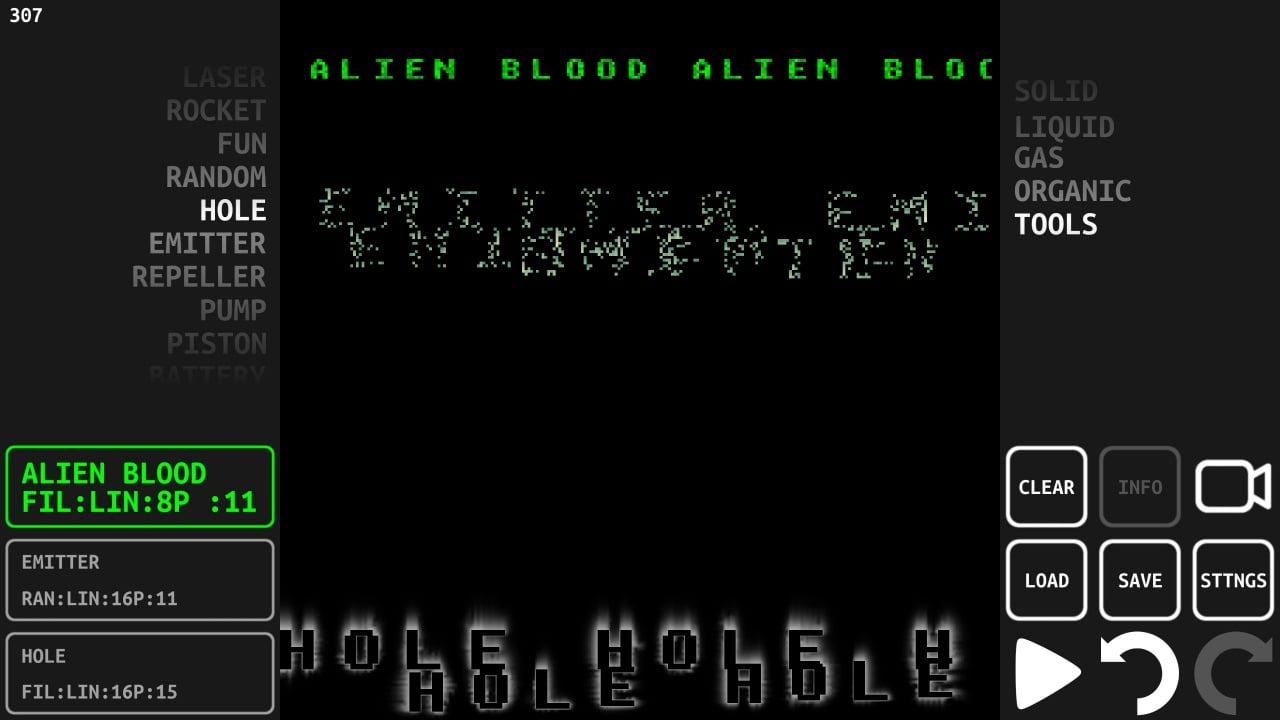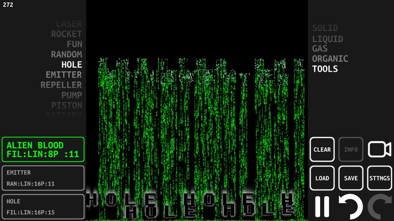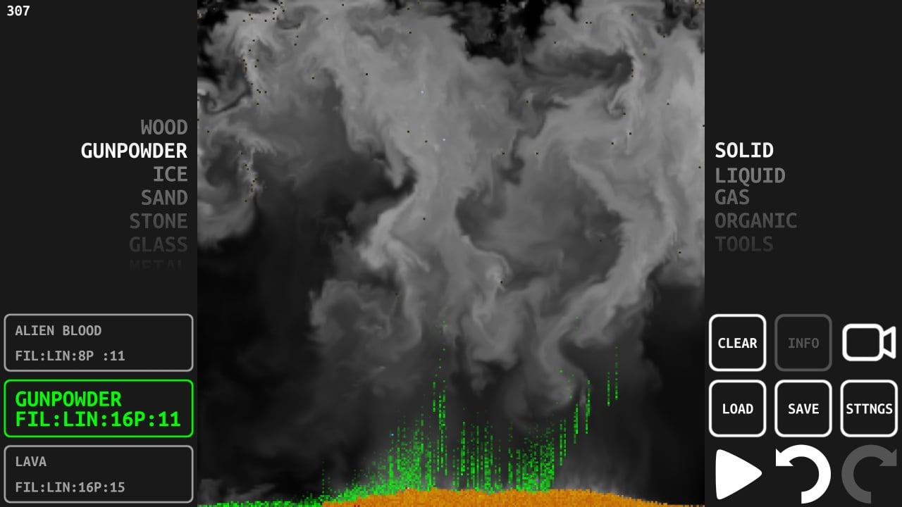 Пользователи могут комбинировать эти объекты по своему усмотрению и наблюдать за их взаимодействиями и реакциями. Дополнительное влияние можно оказывать с помощью излучения и различных стихий, таких как ветер. Всё это позволяет геймерам устраивать пожары, взрывы и задымления, а также менять ландшафт. В проекте имеется встроенный редактор, напоминающий простые графические программы, что позволяет создавать собственные карты и события. Также доступен список заранее созданных уровней. Фон этапов по умолчанию темный, но можно загружать фотографии и картинки с ПК, используя их в качестве задника.