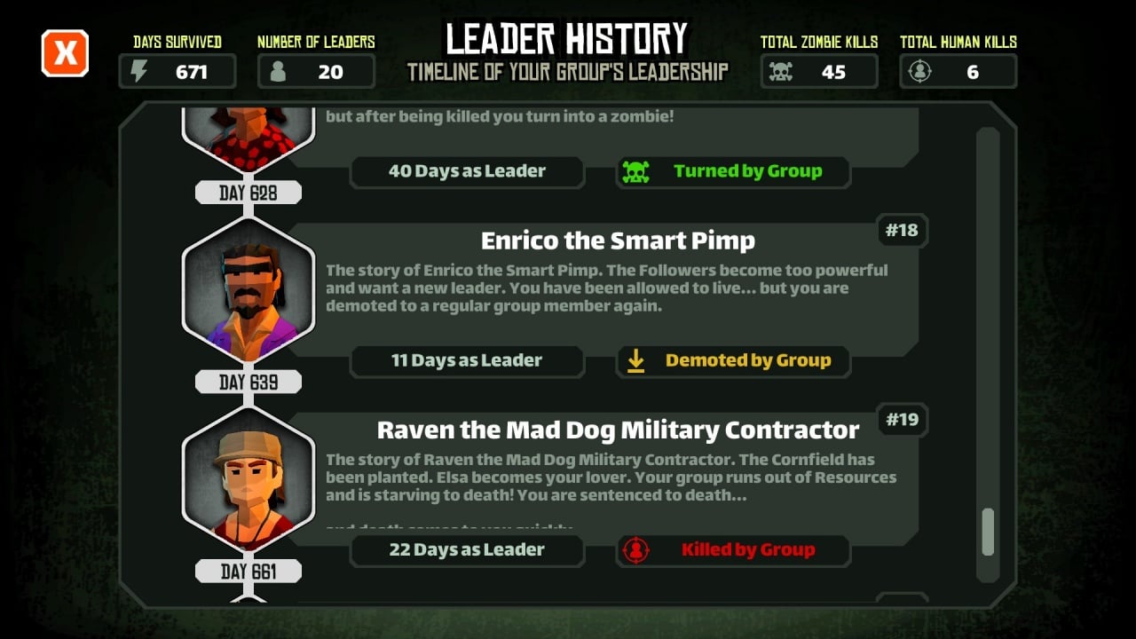 Кроме того, игроку предстоит строить базу. Остальная часть игрового процесса включает текстовые квесты, где нужно выполнять задания, сражаться с зомби, развивать персонажа, знакомиться с другими выжившими и даже завязывать романы. Однако рано или поздно протагонист встретит свою смерть. Умереть можно множеством способов: от нападения до заражения. На место павшего лидера придет новый человек, и история продолжится.