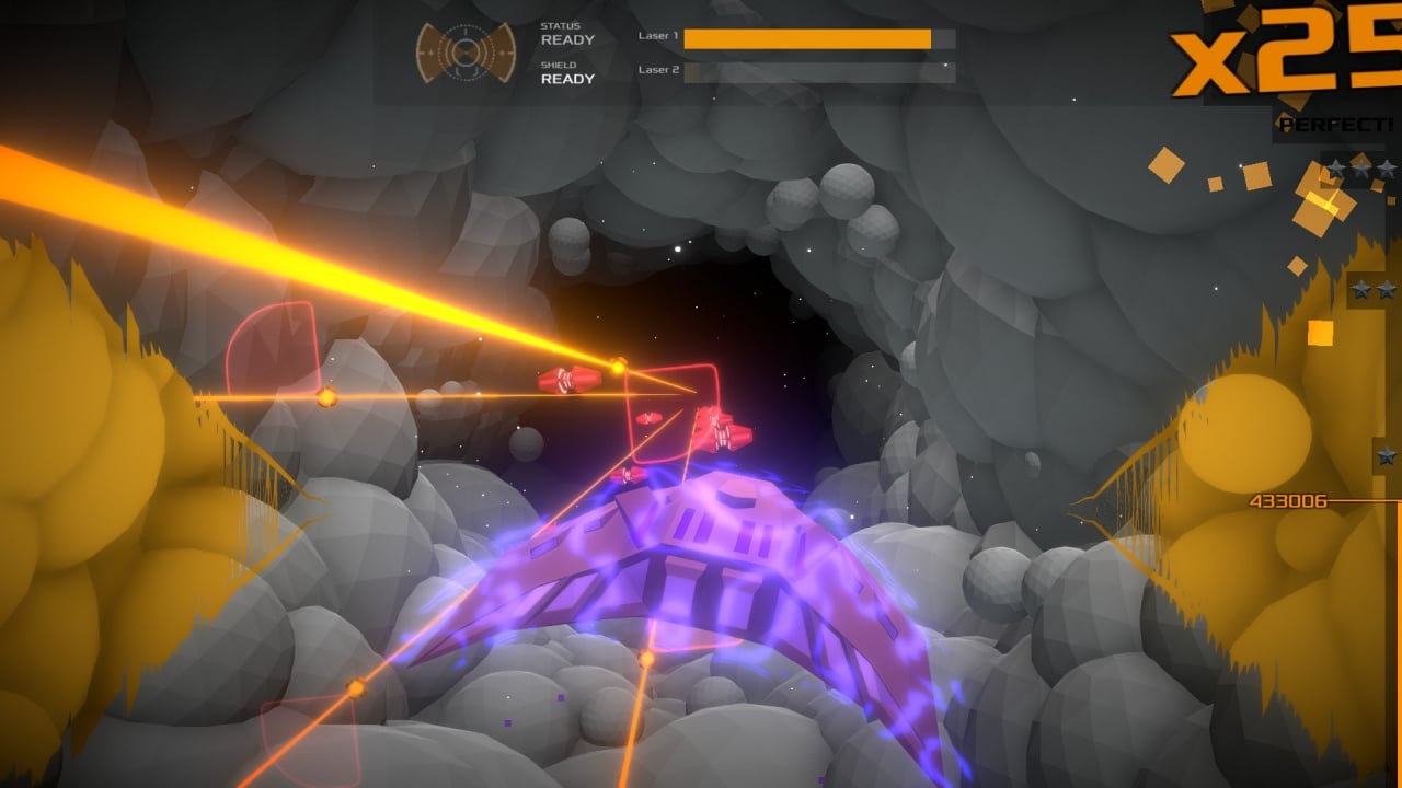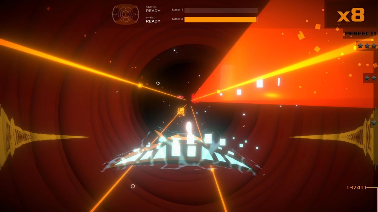 Если враг проскочит мимо, он нанесет урон, создавая дополнительные трудности на пути к завершению уровня. Более сложные оппоненты используют специальные способности, причиняя гораздо больший вред, чем обычные атаки. С самого начала действия разворачиваются в центре пространства, ограниченного лазерными лучами. Корабль движется в заданном радиусе, выходя на траекторию противника. С каждым ударом бита необходимо стрелять, зарабатывая очки за устранение врагов. Чем дальше продвигается пользователь, тем выше счетчик.