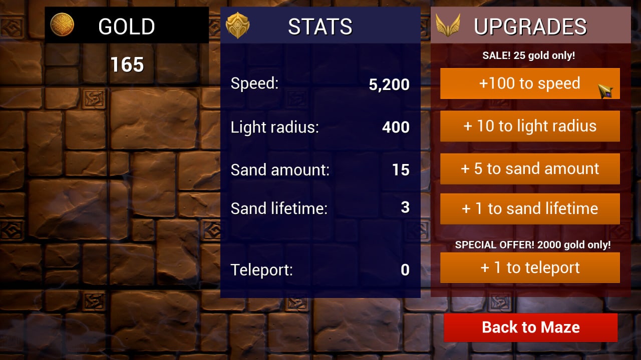 Упростить задачу помогут два улучшения — скорости бега и радиуса света, исходящего от героя. Для их прокачки геймеру нужно собирать золотые монеты, разбросанные по коридорам. Но есть нюанс: чтобы активировать улучшение, следует вернуться ко входу. После смерти все собранные деньги и опыт теряются, и придется начинать с нуля. В самых укромных уголках также спрятаны записки, рассказывающие о судьбе этого мира. Собрав их, можно получить специальное достижение. Однако этот элемент требует времени, которого у пользователя катастрофически не хватает. Без этого, прохождение Maze Gold Run вряд ли окажется легкой задачей.