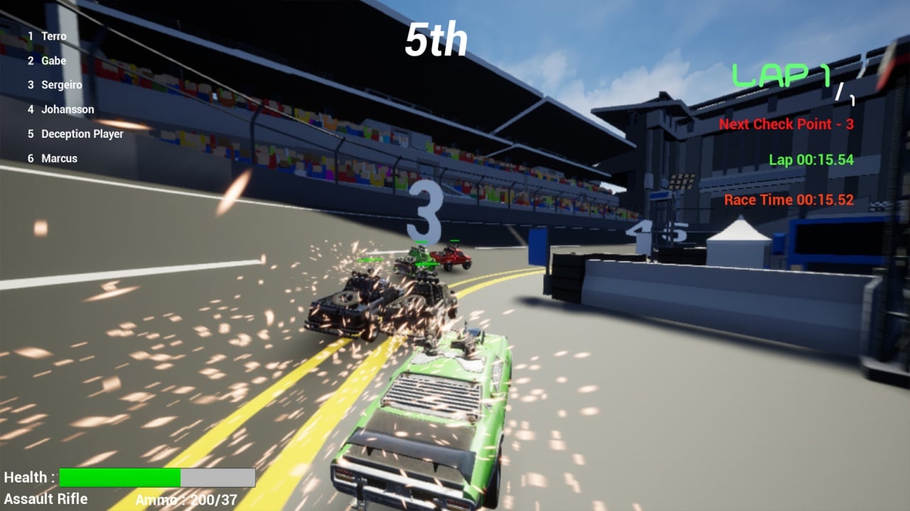 Вас ждут 14 разнообразных трасс, где нужно мчаться на мощных маслкарах. Два типа оружия — гранатомет и штурмовая винтовка — помогут сбивать врагов, не позволяя им обойти вас. Используйте каждую возможность, чтобы занести оппонента на повороте. Доступно несколько режимов. Спринт предлагает гонку от одной точки до другой, а кольцевые заезды требуют дважды преодолеть круг. Не забывайте про специальные контрольно-пропускные пункты — сокращать путь нельзя! Придется следовать трассе! Каждый соперник представляет серьезную угрозу, будьте внимательны! Вам предстоит мчаться по трассам, лесным прериям и гоночным трекам.