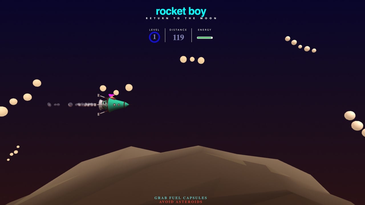 Rocket Boy – казуальная инди-игра, предлагающая бесконечную гонку по космическим просторам с целью достичь Луны. Управляйте ракетой, перемещая мышь вверх и вниз, исследуйте свободное пространство и собирайте горючее. Уклоняйтесь от астероидов, чтобы избежать столкновений. Игра не делится на уровни, но сложность растет с каждым мгновением. Чем дольше пользователь остается в игре, тем быстрее разгоняется летательный аппарат, получая ускорение от собранного топлива.