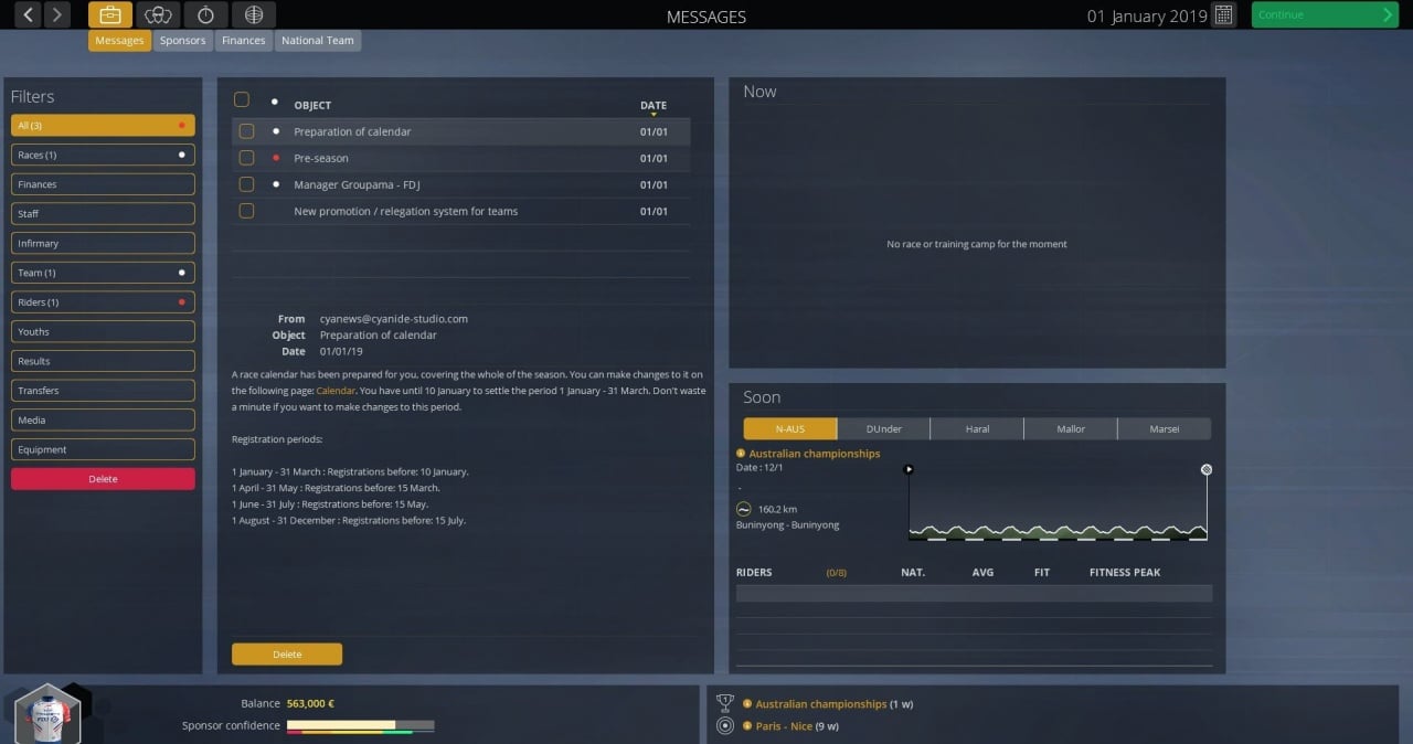 Заботьтесь о тренировках велосипедистов и организуйте их распорядок. Набирайте новых участников и заключайте контракты с рекламодателями. Финансовый аспект играет важную роль, заставляя грамотно балансировать доходы и расходы. Вы не контролируете подопечных напрямую во время гонок. Искусственный интеллект управляет ими, а ваша задача — разрабатывать стратегии и отдавать приказы для корректировки действий спортсменов.