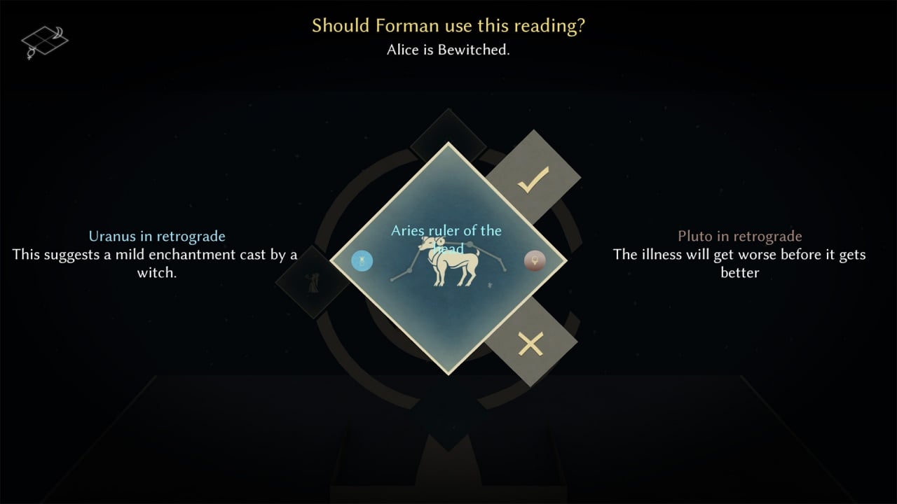 Геймплей Astrologaster напоминает жанр визуальных новелл. Пользователю предстоит выслушивать истории людей и формулировать вопросы, которые затем задаются картам звездного неба для разрешения возникших дилемм. У геймера будет 2-3 варианта выбора, влияющих на развитие событий. Каждый выбор сопровождается подтекстом, чтобы сделать его более осмысленным. Пациенты реагируют на ответы Саймона по-разному; даже если ответ кажется правильным, последствия могут оказаться неожиданными. Визуально проект напоминает книги с аппликациями, но с более проработанным дизайном и уникальным стилем. Что касается звуковой составляющей, всё здесь аутентично и великолепно подобрано. Музыка, озвучка и звуковые эффекты находятся на высоком уровне.