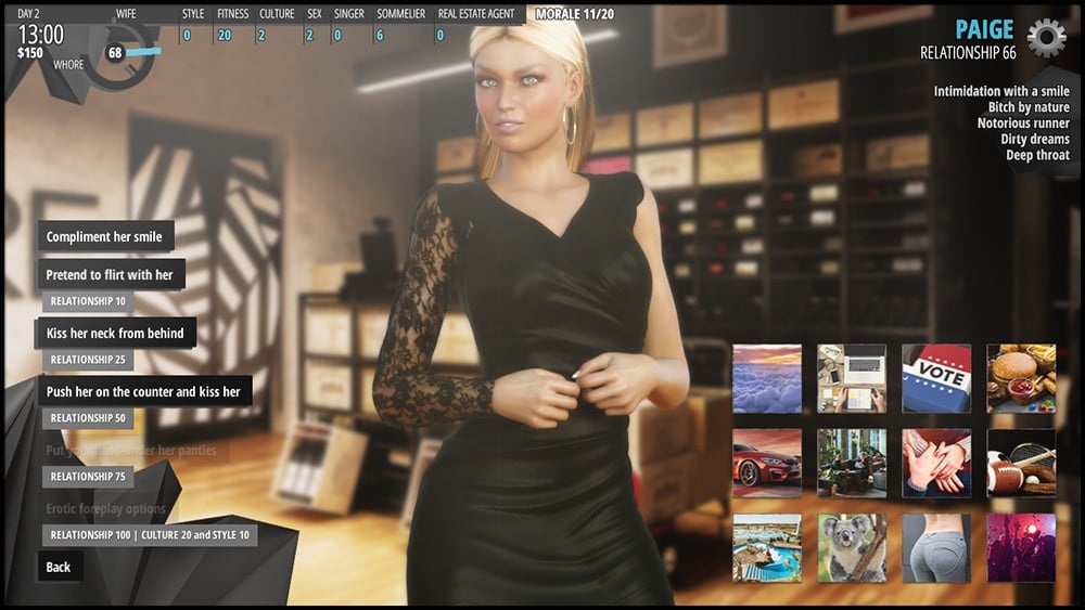 Новая локация "парк" предлагает свежие возможности взаимодействия с секс-шопом. Персонаж Ивон покажет, как применять современные эротические гаджеты. В сюжетной линии Элеонора станет верным другом старых знакомых или же погрузится в более близкие отношения. Вам предстоит уравновешивать её женские обязанности и авантюрный образ жизни, ведь подопечная замужем.