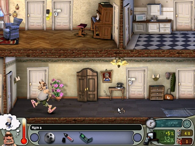 От проделок герой выходит из себя, и его индикатор злости растет. Чем больше антигерой портит нервы своей жертве, тем выше его рейтинг. В награду открываются новые уровни и различные статуэтки. В проекте 14 эпизодов, разделенных на 3 сезона, а также три обучающих пилотных выпуска. Уровни нужно проходить на время, но есть возможность отключить таймер. Протагонист может передвигаться обычным шагом или крадучись, взаимодействуя с окружением. Важно постоянно прятаться от хозяина дома, иначе тот его побьет. В комнатах могут находиться собака или попугай, мимо которых нужно проходить на цыпочках, чтобы не поднять шум. Можно специально создавать звуки, отвлекая тучного мужчину, когда это необходимо.