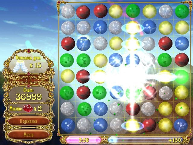 Волшебные Пузыри представляют собой логическую аркаду. Геймеру предстоит перемещать шарики одинакового цвета: красные, синие, желтые и серые. Создавая цепочки из минимум трех фишек, они исчезают, а на их место падают новые сферы. Каждый шар с нимбом содержит духа, который обретает свободу при разрушении такого объекта.