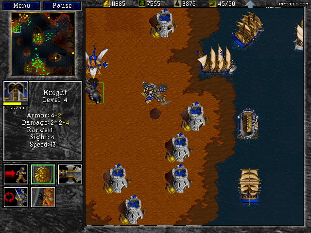 Пользователь строит дороги и стены, а в кузнице кует новые щиты и оружие для юнитов, улучшая их характеристики. Каждый юнит обладает уникальными параметрами: радиус повреждений, здоровье, дальность атаки и броня. Если воин получает урон или замечает врага, он автоматически переходит в бой. В казармах рекрутируются катапульты, лучники, всадники и пехота.