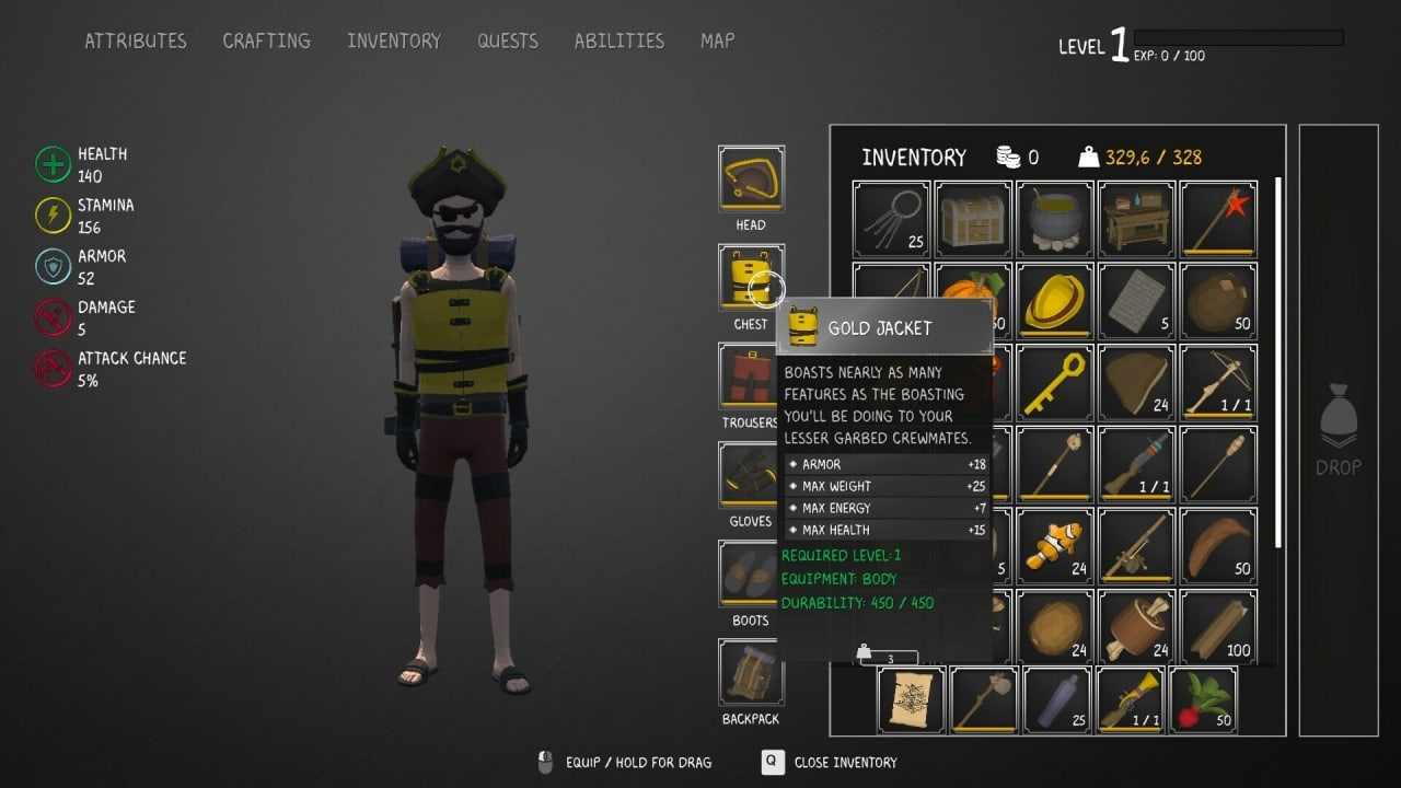 В наличии мультиплеерный PvP-режим. Время суток и сезоны меняются. Доступно 30 видов предметов и более 60 рецептов для крафта. Создание новых предметов открывает ранее недоступные локации. Топором рубят деревья, а лопата пригодится для множества задач. По всему острову разбросаны полезные ископаемые и предметы. Геймеры столкнутся не только с обычными врагами, но и с мощными боссами, решая головоломки и сражаясь за выживание.