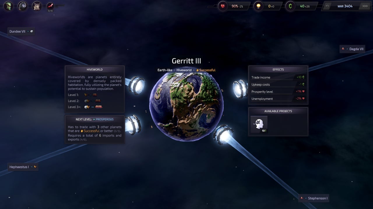 Колонизация планет, выбор направлений развития, соединение их для взаимодействия - вот что ждет пользователя. Геймплей сосредоточен на торговле, а не на войне. Важно развивать деловые отношения. Заключайте контракты, открывайте новые пути снабжения и стройте долгосрочные планы с разными компаниями. Доступно 6 уникальных планет, каждая из которых обладает собственными ресурсами и технологиями. Проявите себя как экономический стратег, оставив силу за бортом. Лишь менеджмент и дипломатия помогут быстро расширить ваше влияние.
