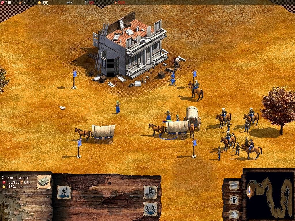 Построив ранчо, можно увеличить запасы пищи до 80 единиц. Кампании состоят из заданий по 6-8 миссий. Все 4 сценария имеют свои особенности и уникальные механики. Особенно интересно играть за бандитов. Они не производят ресурсы, а грабят врагов. Основная пища - виски. За разбойников геймплей превращается в тактическую стратегию, в то время как другие фракции предлагают классическую RTS.