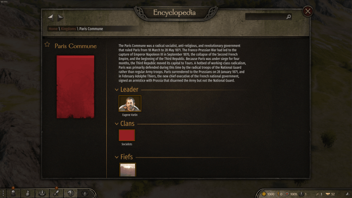 Хорошо укомплектованная армия Пруссии атаковала Париж, захватила его, начала навязывать свои порядки, используя город как колонию. В результате правительство перебазировалось в Тур. Из войск, пытающихся противодействовать прусской армии, остались только члены социалистической национальной гвардии. После долгих демократических переговоров был достигнут мир с Пруссией. Однако взамен французская армия Mount & Blade 2: Bannerlord - la Commune de Paris должна была разоружиться, остались лишь отряды Garden Nationale. Это решение не устроило многих, и 18 марта 1871 года пролетариат создает Парижскую Коммуну под протекторатом Национальной гвардии. Уставшая от войны с Пруссией, Франция фактически разделилась на два противостоящих друг другу государства.