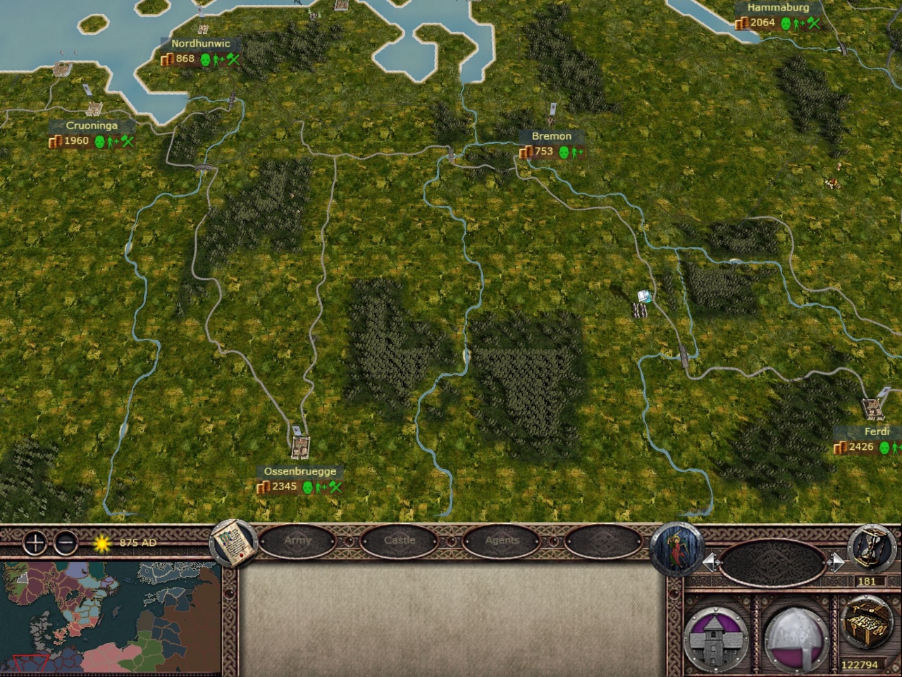 На обширных просторах Скандинавии расположены небольшие королевства викингов. Балтийские племена представлены пруссами и куршами. Центром цивилизации того времени считается Франкское королевство. Славяне, такие как ободриты и венеды, также играют свою роль. Мировые религии ограничиваются двумя — христианством и язычеством. Пользователь может выбрать свою веру, но для этого необходимо строить капища и храмы с дальнейшими улучшениями. Еретики оказывают заметное влияние — 20%. Первоначальными христианами являются франки, но веру можно принять по желанию. Каждый лорд начинает с 1-2 провинциями. Уровни поселений невелики, и население не превышает 800 человек. Это число не способно покрыть расходы на содержание армий. Небольшие отряды достаточно для захвата соседних селений. Сложности добавляет высокая стоимость наемников и ограниченные слоты для 2-3 типов пехотинцев, которые еще предстоит открыть. Династии правителей быстро разрастаются, но в начале большинство армий состоит из копейщиков, топорщиков и стрелков.