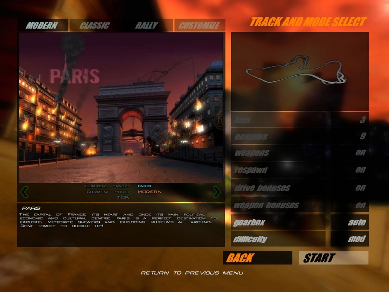 В гараже доступно 10 футуристических болидов, каждый из которых уникален по характеристикам и дизайну. Их можно модернизировать, менять вооружение и тюнинговать. Перед заездом пользователь выбирает 3 из 7 видов оружия. Оружие покупается за деньги, которые зарабатываются в гонках. Побеждает тот, кто первым пересечет финишную черту. Если машина персонажа разрушена, можно начать заново или появиться в том же месте через несколько секунд с нулевой скоростью.