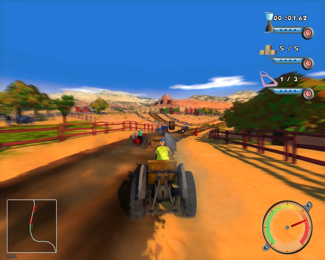 У проекта есть краткое название – Farm Racer. Он выделяется низкополигональной, мультяшной графикой и минималистичным интерфейсом. На экране появляются мини-карта, спидометр и таймер. Всё подается с долей юмора.
