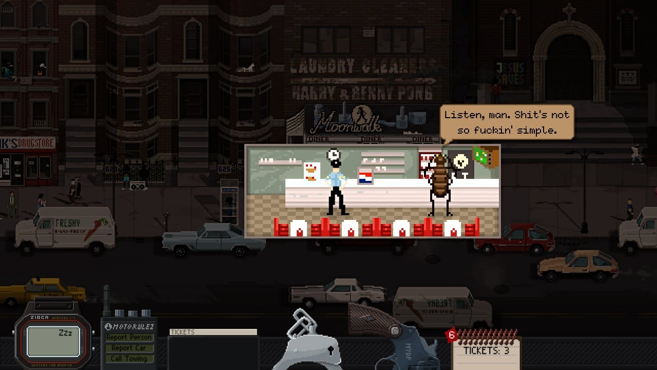 Друзья предали Джека, оставив его в опасном мире. Он стоит перед выбором: сдаться или действовать. Его начальник — настоящий тиран, жена требует денег, а мафия готова расправиться с ним в любой момент. Действия разворачиваются в Бруклине, где жизнь патрульного полна трудностей. Основной способ выживания — это выписывание штрафов нарушителям. Нелинейный сюжет предложит несколько концовок, если вы будете исследовать каждый уголок города в поисках правды. Расследование станет легче, если понять атмосферу своего времени. Шутки и истории Джека помогут адаптироваться к бурной жизни 80-х, где криминал, наркотики и свобода процветают. Каждый день он выходит на работу, но с каждым разом к нему будут относиться все более презрительно, ведь загадочное убийство отравляет жизнь каждого. Справитесь ли вы с этой задачей?