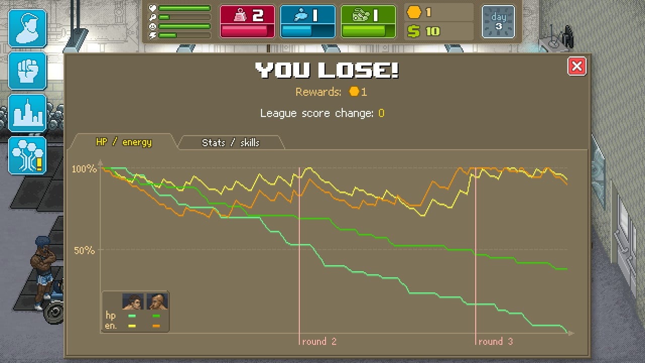 Боевые характеристики включают силу, выносливость и ловкость. Их прокачка происходит различными способами: отжимания в гараже, тренировки в спортзале за деньги или покупка снаряжения для дома. Игра тщательно сбалансирована, и постоянное улучшение невозможно в начале, так как средств катастрофически не хватает. Участвуя в спаррингах, вы зарабатываете скил-поинты для улучшения умений и навыков. Уличные бои предлагают возможность делать ставки и заработать, но требуют опыта. Punch Club привлечет любителей менеджеров и 8-битной графики. И запомните, первое правило панч клуба – никому не говорите о панч клубе.