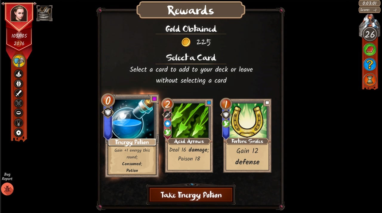 Атакующая категория включает карты, такие как Poison, Burn, Frost, Expose, Bleed и Shock. Игра предлагает простую ролевую систему. Можно создавать зелья, выбирая наиболее эффективные для боя. Но инвентарь ограничен, поэтому необходимо тщательно подбирать лучшие вспомогательные предметы. Карты могут получать как длительное, так и временное улучшение. В ходе прохождения открываются новые классы, карты, экипировка, события и монстры. Кроме основного сюжета доступны еще два режима: Испытания и Одиссея.