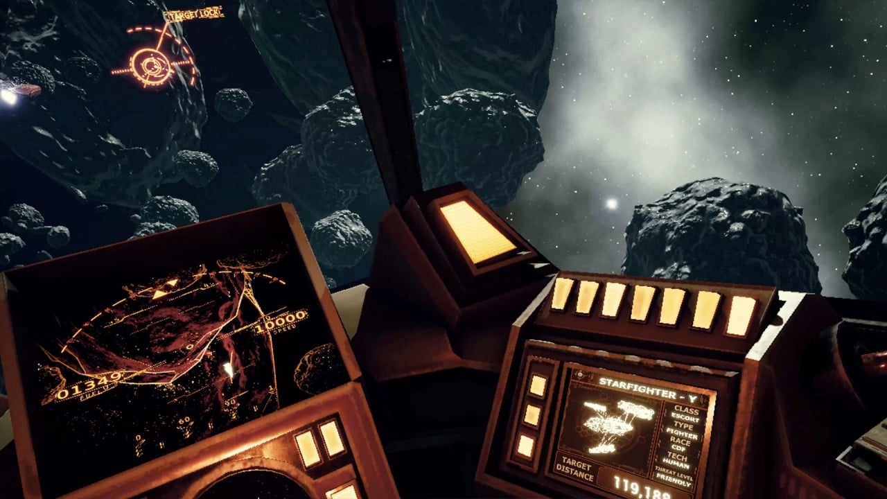 CDF Starfighter VR - космический симулятор, который помещает пользователя в кабину боевого Старфайтера - передового звездного истребителя. Игра предназначена для устройств виртуальной реальности и поддерживает шлемы Valve Index, HTC Vive, Oculus Rift и Windows Mixed Reality. События разворачиваются через 350 лет.