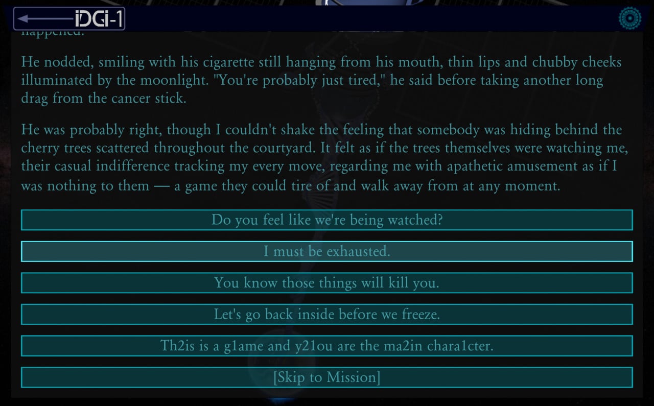 По своей сути, Whispers From The Rift — визуальная новелла, насыщенная текстом. Здесь много слов — более 400000. Картинки тоже присутствуют, но основная часть повествования представлена в текстовом формате. Геймер часто сталкивается с выбором, влияющим на дальнейшее развитие сюжета. Не понравилась развязка? Вернитесь назад и попробуйте другие варианты. Проект предлагает более сотни концовок — от счастливых до трагичных. Нелинейность достигается за счёт около 100 глобальных переменных.