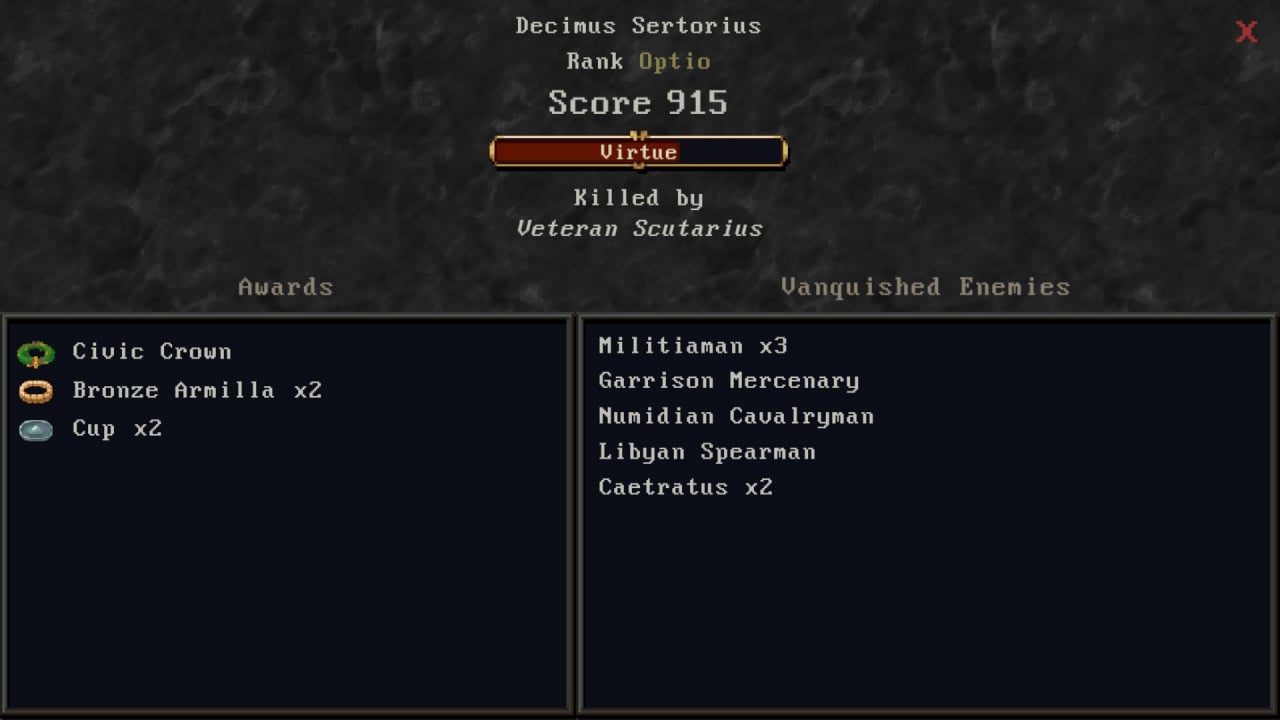 Геймплей сосредоточен на чтении информации и принятии решений. Сначала пользователь создает персонажа, распределяя очки между силой, ловкостью, выносливостью, телосложением, координацией, харизмой, интеллектом и знаниями. Затем он пытается построить карьеру в Римском легионе во времена Второй Пунической войны, собирая уникальные билды.
