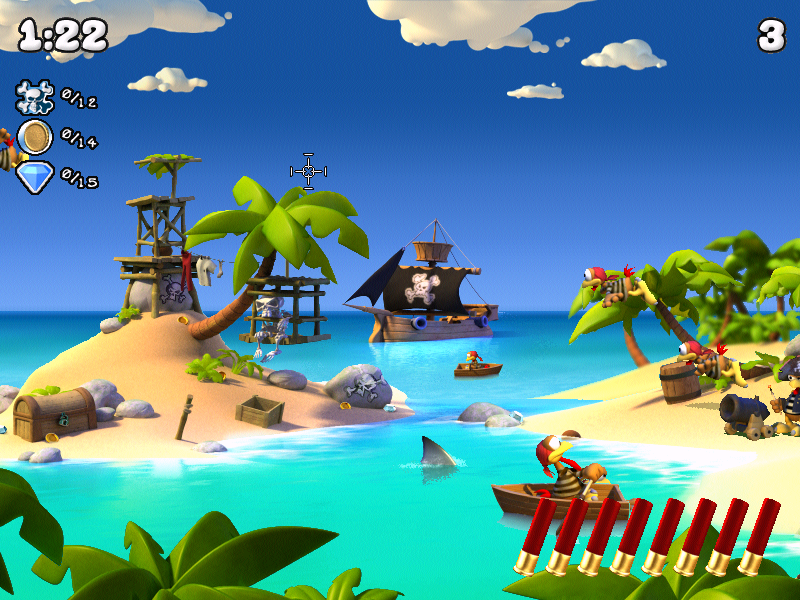 Капитаны в треуголках и кафтанаx управляют своими пиратами, заставляя их перетаскивать мешки с сокровищами. На тропических островах даже приземляется НЛО, добавляя элемент сюрреализма. Пространство полно секретов и кладов, которые ждут своих искателей. За нахождение сокровищ полагаются щедрые вознаграждения. Геймплей сосредоточен на отстреле всего, что попадается на глаза, включая эксцентричных птиц. Попав в область с секретом, можно открыть сундук и другие ценные предметы. Комбинации очков варьируются от 5 до 150. Если за 90 секунд удастся набрать тысячу очков, откроется секретный уровень. Лучшие стрелки получат возможность стрелять из тяжелой пушки.