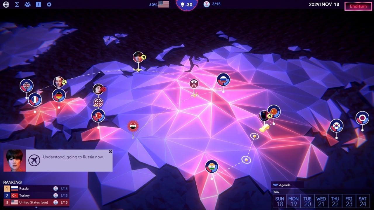 Пользователь возглавляет одну из таких команд, названную "Сигмой". Его задача — помочь нации установить контроль над миром. Сначала геймер формирует отряд из четырех спецагентов. Доступно 50 кандидатов, и некоторые из них открываются только в ходе игры. Каждый из них обладает уникальными характерами, перками и биографиями, что влияет на их поведение в заданиях.